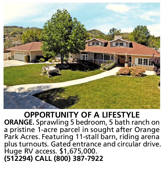 OPPORTUNITY OF A LIFESTYLE ORANGE. Sprawling 5 bedroom, 5 bath ranch on a pristine 1-acre parcel in sought after Orange Park Acres. Featuring 11-stall barn, riding arena plus turnouts. Gated entrance and circular drive. Huge RV access. $1,675,000. (512294) CALL (800) 387-7922