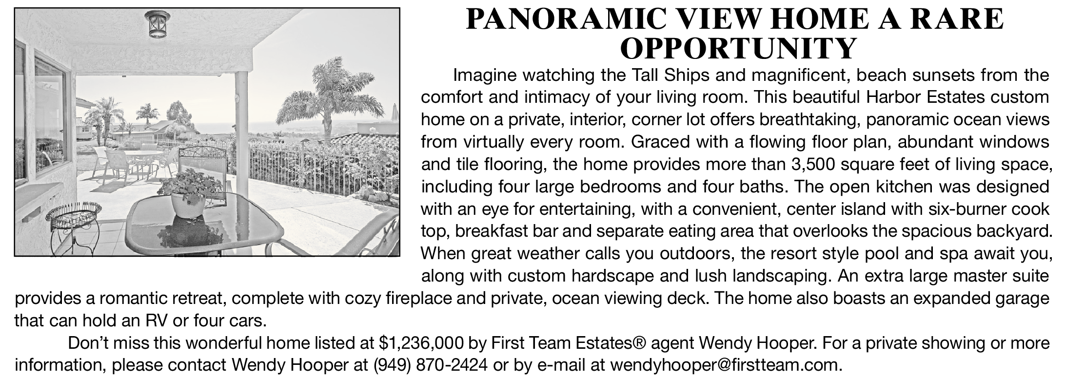 PANORAMIC VIEW HOME A RARE OPPORTUNITY Imagine watching the Tall Ships and magnificent, beach sunsets from the comfort and intimacy of your living room. This beautiful Harbor Estates custom home on a private, interior, corner lot offers breathtaking, panoramic ocean views from virtually every room. Graced with a flowing floor plan, abundant windows and tile flooring, the home provides more than 3,500 square feet of living space, including four large bedrooms and four baths. The open kitchen was designed with an eye for entertaining, with a convenient, center island with six-burner cook top, breakfast bar and separate eating area that overlooks the spacious backyard. When great weather calls you outdoors, the resort style pool and spa await you, along with custom hardscape and lush landscaping. An extra large master suite provides a romantic retreat, complete with cozy fireplace and private, ocean viewing deck. The home also boasts an expanded garage that can hold an RV or four cars. Don’t miss this wonderful home listed at $1,236,000 by First Team Estates® agent Wendy Hooper. For a private showing or more information, please contact Wendy Hooper at (949) 870-2424 or by e-mail at wendyhooper@firstteam.com.