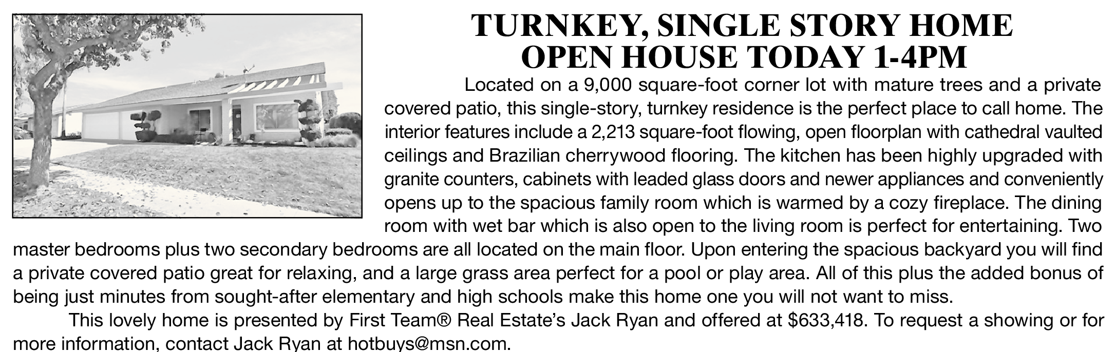 TURNKEY, SINGLE STORY HOME OPEN HOUSE TODAY 1-4PM Located on a 9,000 square-foot corner lot with mature trees and a private covered patio, this single-story, turnkey residence is the perfect place to call home. The interior features include a 2,213 square-foot flowing, open floorplan with cathedral vaulted ceilings and Brazilian cherrywood flooring. The kitchen has been highly upgraded with granite counters, cabinets with leaded glass doors and newer appliances and conveniently opens up to the spacious family room which is warmed by a cozy fireplace. The dining room with wet bar which is also open to the living room is perfect for entertaining. Two master bedrooms plus two secondary bedrooms are all located on the main floor. Upon entering the spacious backyard you will find a private covered patio great for relaxing, and a large grass area perfect for a pool or play area. All of this plus the added bonus of being just minutes from sought-after elementary and high schools make this home one you will not want to miss. This lovely home is presented by First Team® Real Estate’s Jack Ryan and offered at $633,418. To request a showing or for more information, contact Jack Ryan at hotbuys@msn.com.