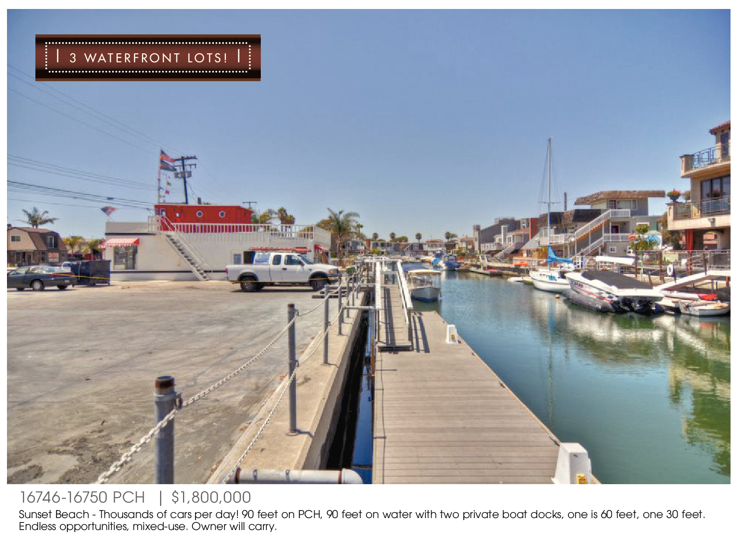 16746-16750 PCH | $1,800,000 Sunset Beach - Thousands of cars per day! 90 feet on PCH, 90 feet on water with two private boat docks, one is 60 feet, one 30 feet. Endless opportunities, mixed-use. Owner will carry.