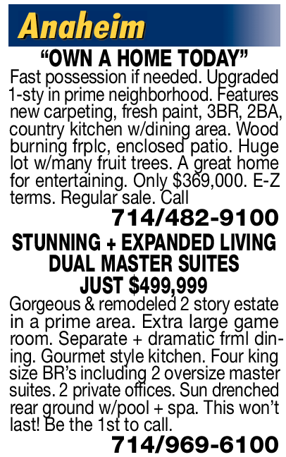 Anaheim “OWN A HOME TODAY” Fast possession if needed. Upgraded 1-sty in prime neighborhood. Features new carpeting, fresh paint, 3BR, 2BA, country kitchen w/dining area. Wood burning frplc, enclosed patio. Huge lot w/many fruit trees. A great home for entertaining. Only $369,000. E-Z terms. Regular sale. Call 714/482-9100 STUNNING + EXPANDED LIVING DUAL MASTER SUITES JUST $499,999 Gorgeous & remodeled 2 story estate in a prime area. Extra large game room. Separate + dramatic frml dining. Gourmet style kitchen. Four king size BR’s including 2 oversize master suites. 2 private offices. Sun drenched rear ground w/pool + spa. This won’t last! Be the 1st to call. 714/969-6100