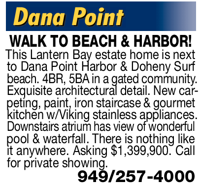 Dana Point WALK TO BEACH & HARBOR! This Lantern Bay estate home is next to Dana Point Harbor & Doheny Surf beach. 4BR, 5BA in a gated community. Exquisite architectural detail. New carpeting, paint, iron staircase & gourmet kitchen w/Viking stainless appliances. Downstairs atrium has view of wonderful pool & waterfall. There is nothing like it anywhere. Asking $1,399,900. Call for private showing. 949/257-4000