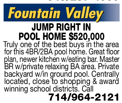 949/257-4000 Fountain Valley JUMP RIGHT IN POOL HOME $520,000 Truly one of the best buys in the area for this 4BR/2BA pool home. Great floor plan, newer kitchen w/eating bar. Master BR w/private relaxing BA area. Private backyard w/in ground pool. Centrally located, close to shopping & award winning school districts. Call 714/964-2121 See also