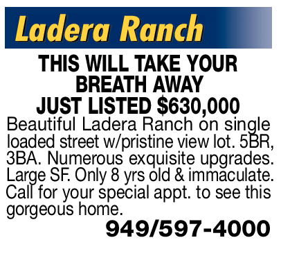 Ladera Ranch THIS WILL TAKE YOUR BREATH AWAY JUST LISTED $630,000 Beautiful Ladera Ranch on single loaded street w/pristine view lot. 5BR, 3BA. Numerous exquisite upgrades. Large SF. Only 8 yrs old & immaculate. Call for your special appt. to see this gorgeous home. 949/597-4000