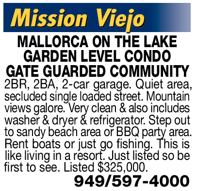 Mission Viejo MALLORCA ON THE LAKE GARDEN LEVEL CONDO GATE GUARDED COMMUNITY 2BR, 2BA, 2-car garage. Quiet area, secluded single loaded street. Mountain views galore. Very clean & also includes washer & dryer & refrigerator. Step out to sandy beach area or BBQ party area. Rent boats or just go fishing. This is like living in a resort. Just listed so be first to see. Listed $325,000. 949/597-4000