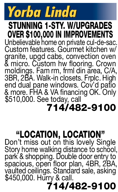 Custom features. Gourmet kitchen w/ granite, upgd cabs, convection oven & micro. Custom hw flooring. Crown moldings. Fam rm, frml din area, C/A, 3BR, 2BA. Walk-in closets. Frplc. High end dual pane windows. Cov’d patio & more. FHA & VA financing OK. Only $510,000. See today, call 714/482-9100