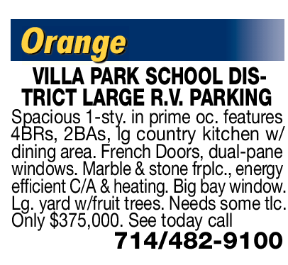 upgrades. immaculate. Orange VILLA PARK SCHOOL DIS- TRICT LARGE R.V. PARKING Spacious 1-sty. in prime oc. features 4BRs, 2BAs, lg country kitchen w/ dining area. French Doors, dual-pane windows. Marble & stone frplc., energy efficient C/A & heating. Big bay window. Lg. yard w/fruit trees. Needs some tlc. Only $375,000. See today call 714/482-9100