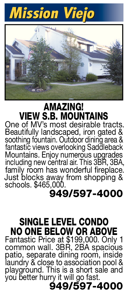suites. week. 5BR, Mission Viejo AMAZING! VIEW S.B. MOUNTAINS One of MV’s most desirable tracts. Beautifully landscaped, iron gated & soothing fountain. Outdoor dining area & fantastic views overlooking Saddleback Mountains. Enjoy numerous upgrades including new central air. This 3BR, 3BA, family room has wonderful fireplace. Just blocks away from shopping & schools. $465,000. 949/597-4000 SINGLE LEVEL CONDO NO ONE BELOW OR ABOVE Fantastic Price at $199,000. Only 1 common wall. 3BR, 2BA spacious patio, separate dining room, inside laundry & close to association pool & playground. This is a short sale and you better hurry it will go fast. 949/597-4000