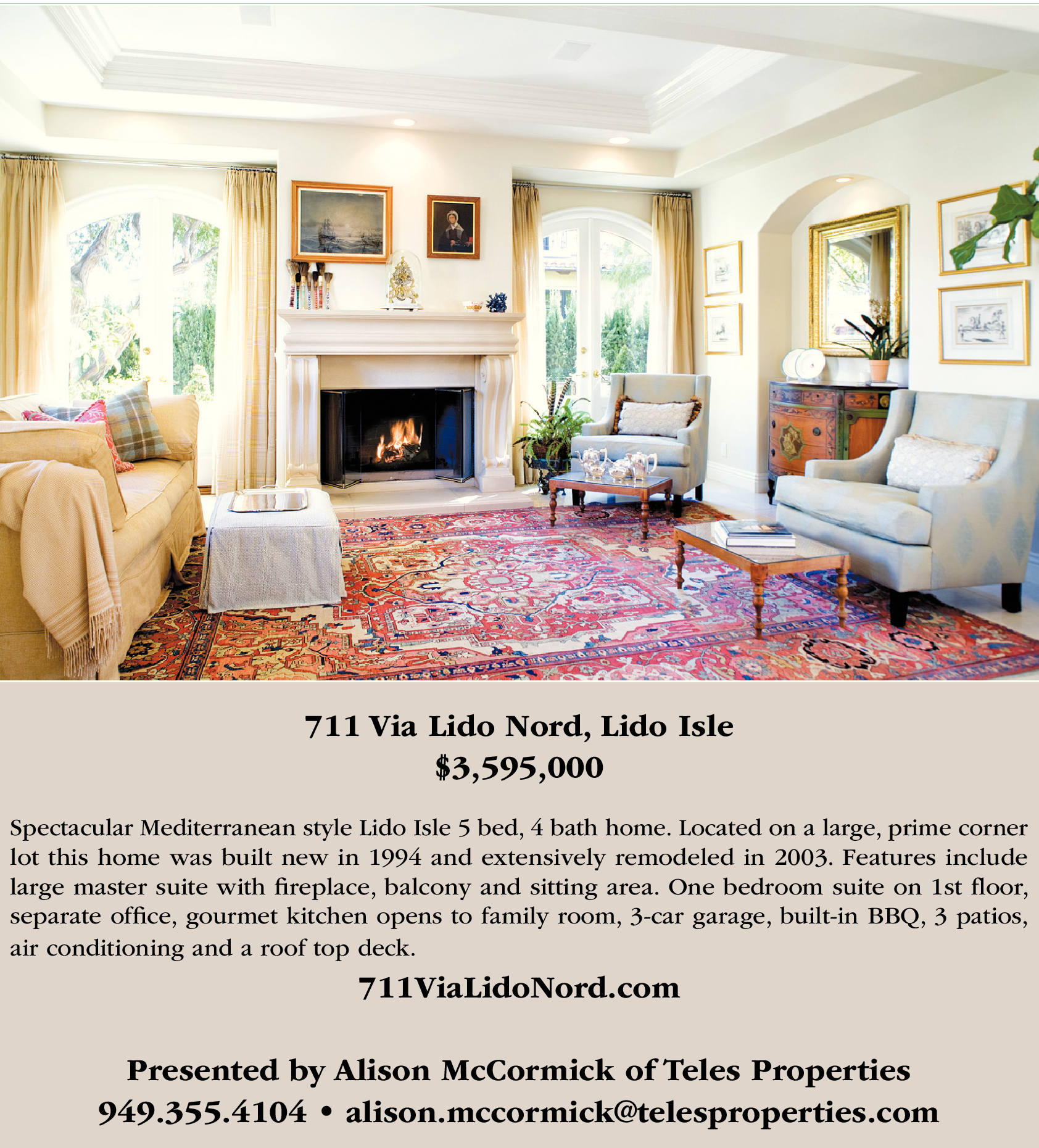 711 Via Lido Nord, Lido Isle $3,595,000 Spectacular Mediterranean style Lido Isle 5 bed, 4 bath home. Located on a large, prime corner lot this home was built new in 1994 and extensively remodeled in 2003. Features include large master suite with fireplace, balcony and sitting area. One bedroom suite on 1st floor, separate office, gourmet kitchen opens to family room, 3-car garage, built-in BBQ, 3 patios, air conditioning and a roof top deck. 711ViaLidoNord.com Presented by Alison McCormick of Teles Properties 949.355.4104 • alison.mccormick@telesproperties.com