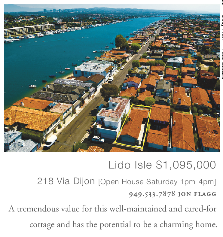 Lido Isle $1,095,000 218 Via Dijon [Open House Saturday 1pm-4pm] 949.533.7878 jon flagg A tremendous value for this well-maintained and cared-for cottage and has the potential to be a charming home.