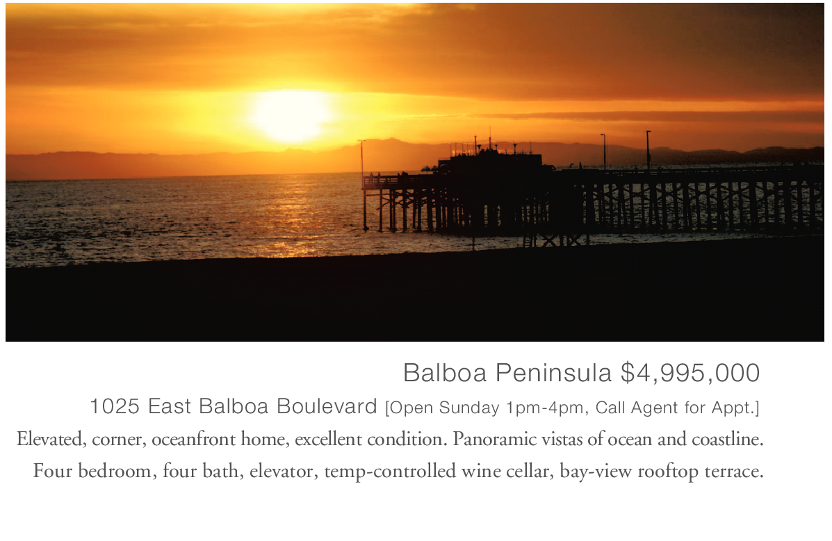 Balboa Peninsula $4,995,000 1025 East Balboa Boulevard [Open Sunday 1pm-4pm, Call Agent for Appt.] Elevated, corner, oceanfront home, excellent condition. Panoramic vistas of ocean and coastline. Four bedroom, four bath, elevator, temp-controlled wine cellar, bay-view rooftop terrace.