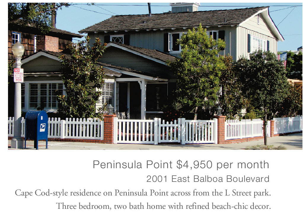 Peninsula Point $4,950 per month 2001 East Balboa Boulevard Cape Cod-style residence on Peninsula Point across from the L Street park.