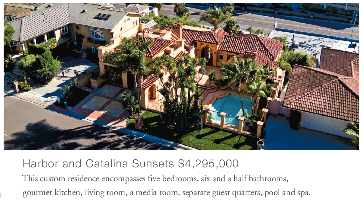 Harbor and Catalina Sunsets $4,295,000 This custom residence encompasses five bedrooms, six and a half bathrooms, gourmet kitchen, living room, a media room, separate guest quarters, pool and spa.