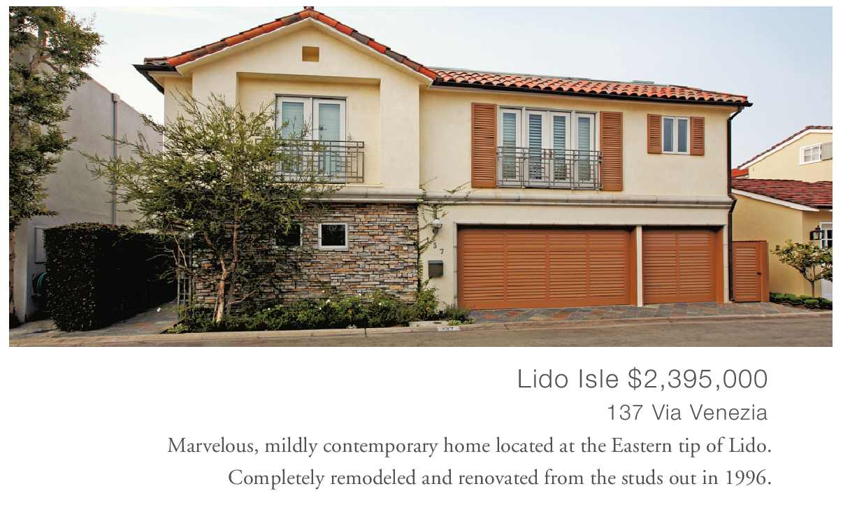 Lido Isle $2,395,000 137 Via Venezia Marvelous, mildly contemporary home located at the Eastern tip of Lido.