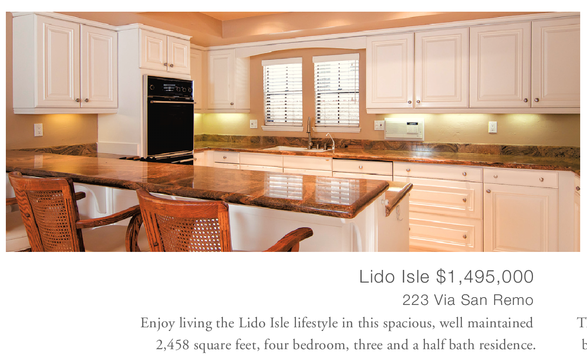 Lido Isle $1,495,000 223 Via San Remo Enjoy living the Lido Isle lifestyle in this spacious, well maintained 2,458 square feet, four bedroom, three and a half bath residence.