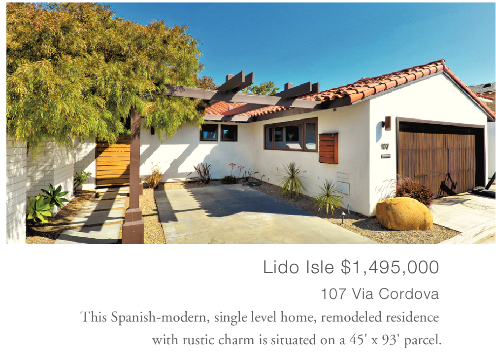 Lido Isle $1,495,000 107 Via Cordova This Spanish-modern, single level home, remodeled residence with rustic charm is situated on a 45' x 93' parcel.