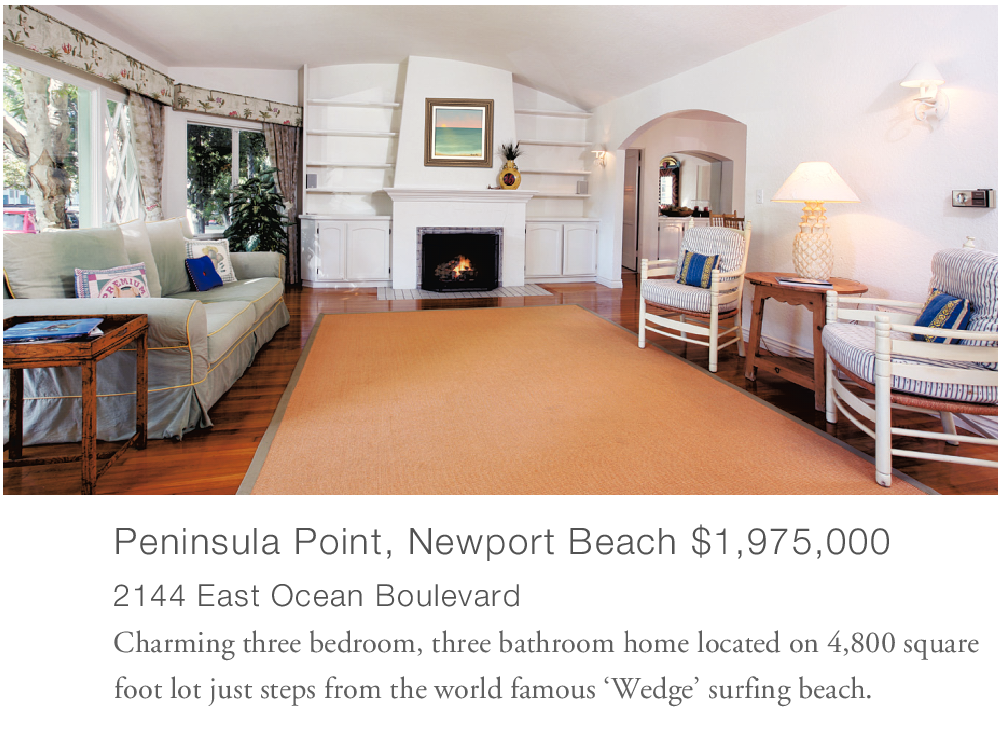 Peninsula Point, Newport Beach $1,975,000 2144 East Ocean Boulevard Charming three bedroom, three bathroom home located on 4,800 square foot lot just steps from the world famous ‘Wedge’ surfing beach.