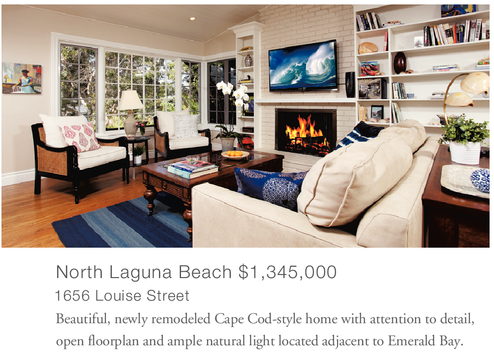 North Laguna Beach $1,345,000 1656 Louise Street Beautiful, newly remodeled Cape Cod-style home with attention to detail, open floorplan and ample natural light located adjacent to Emerald Bay.