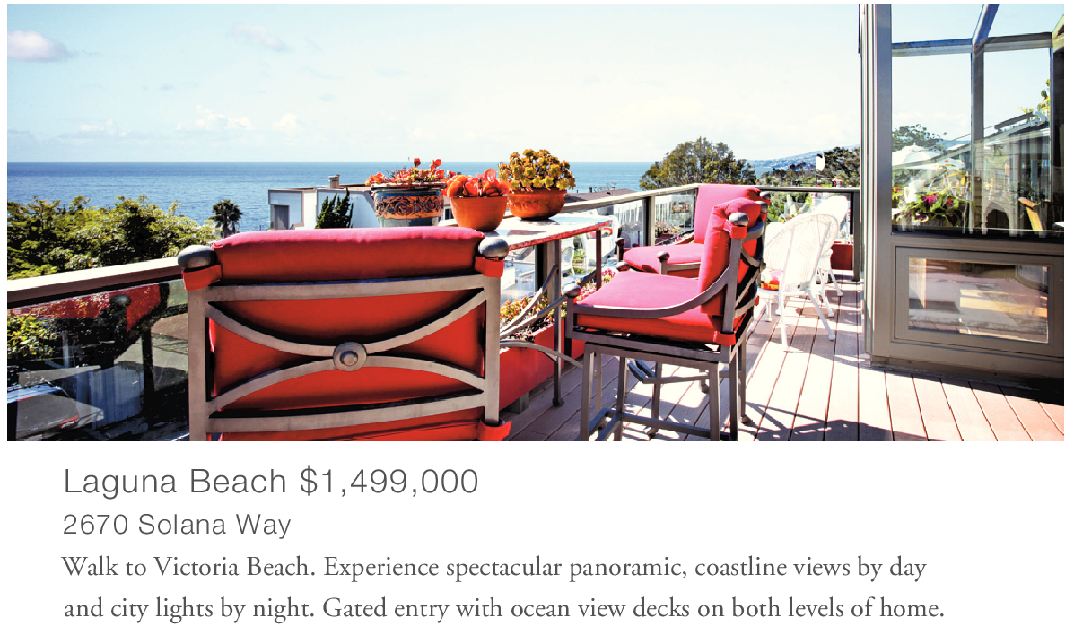 Laguna Beach $1,499,000 2670 Solana Way Walk to Victoria Beach. Experience spectacular panoramic, coastline views by day and city lights by night. Gated entry with ocean view decks on both levels of home.