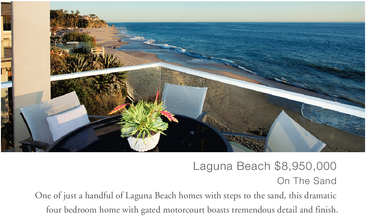 Laguna Beach $8,950,000 On The Sand One of just a handful of Laguna Beach homes with steps to the sand, this dramatic four bedroom home with gated motorcourt boasts tremendous detail and finish.