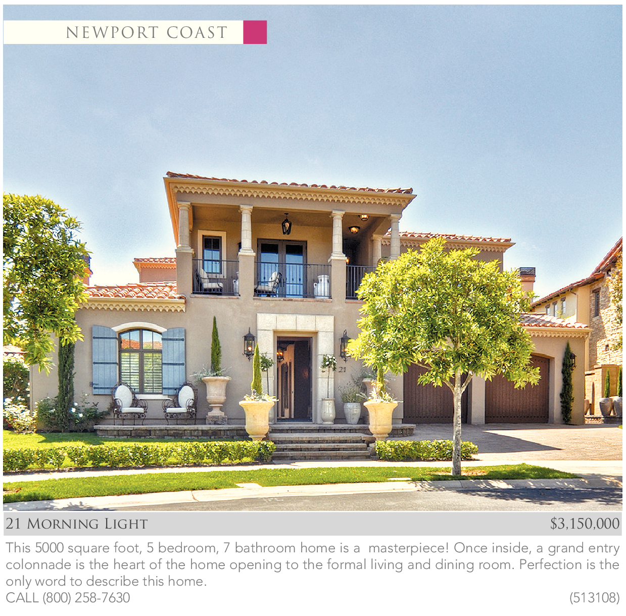NEWPORT COAST 21 Morning Light $3,150,000 This 5000 square foot, 5 bedroom, 7 bathroom home is a masterpiece! Once inside, a grand entry colonnade is the heart of the home opening to the formal living and dining room. Perfection is the only word to describe this home. CALL (800) 258-7630 (513108) See also