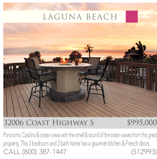 32006 Coast Highway S $995,000 Panoramic Catalina & ocean views with the smell & sound of the ocean waves from this great property. This 3 bedroom and 2 bath home has a gourmet kitchen & French doors. CALL (800) 387-1447 (512993)