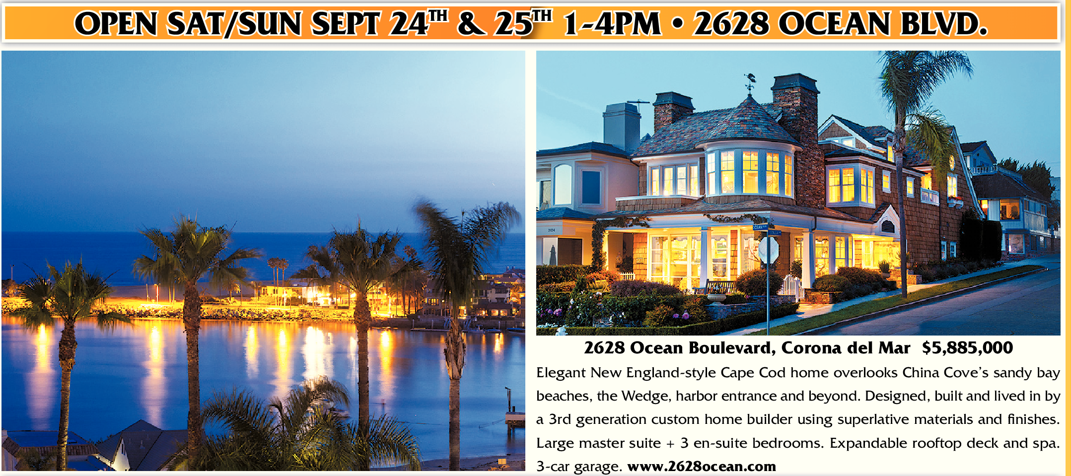 OPEN SAT/SUN SEPT 24 TH & 25 TH 1-4PM • 2628 OCEAN BLVD. 2628 Ocean Boulevard, Corona del Mar $5,885,000 Elegant New England-style Cape Cod home overlooks China Cove’s sandy bay beaches, the Wedge, harbor entrance and beyond. Designed, built and lived in by a 3rd generation custom home builder using superlative materials and finishes. Large master suite + 3 en-suite bedrooms. Expandable rooftop deck and spa. 3-car garage. www.2628ocean.com
