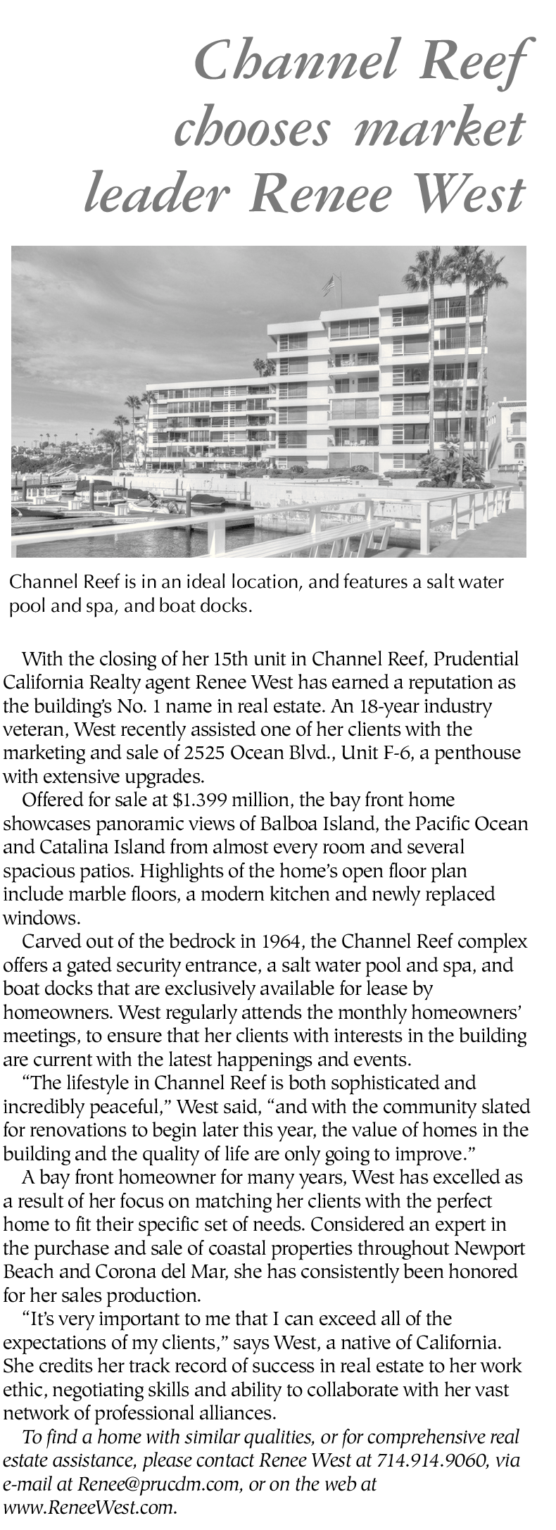 With the closing of her 15th unit in Channel Reef, Prudential California Realty agent Renee West has earned a reputation as the building’s No. 1 name in real estate. An 18-year industry veteran, West recently assisted one of her clients with the marketing and sale of 2525 Ocean Blvd., Unit F-6, a penthouse with extensive upgrades.
