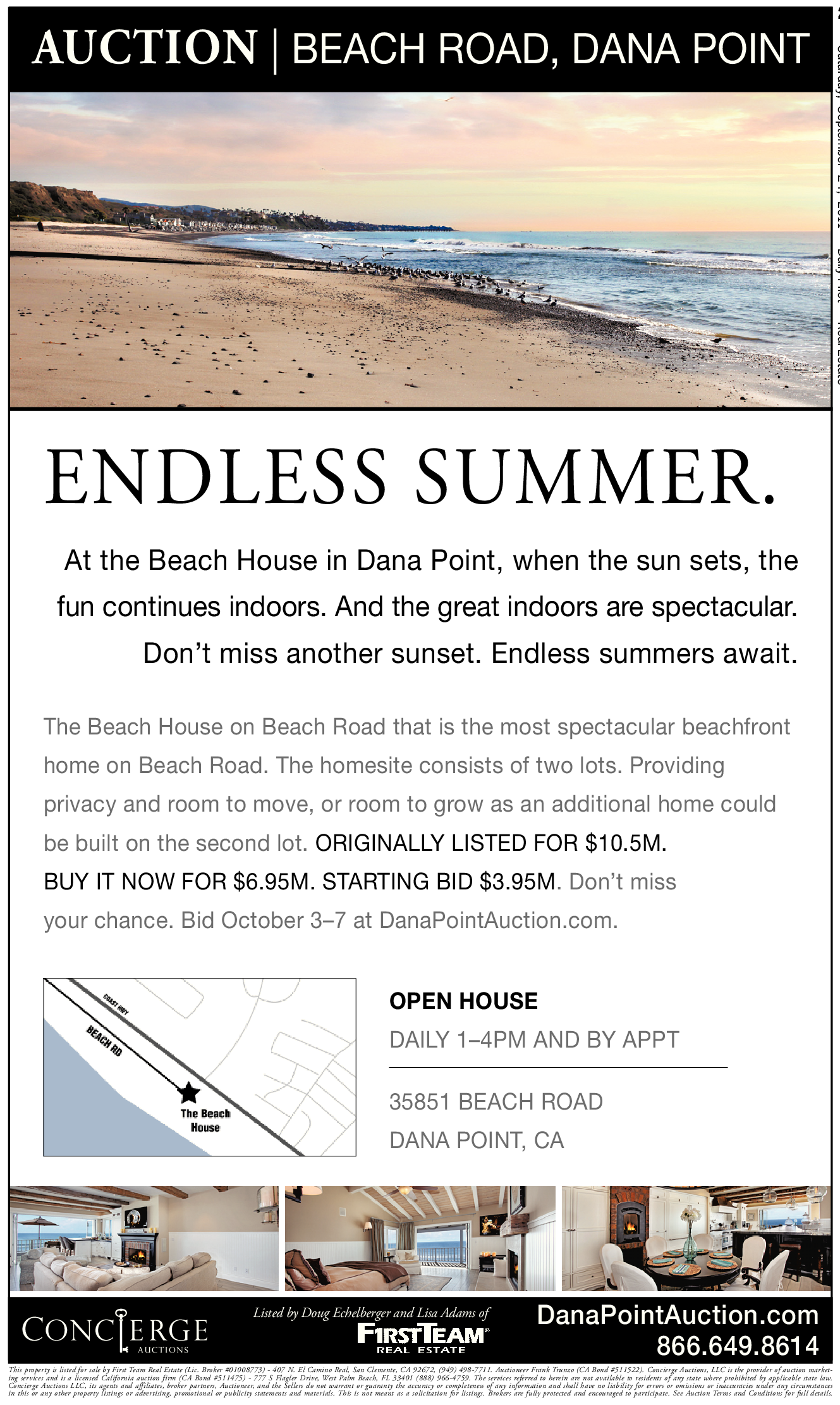 The Beach House on Beach Road that is the most spectacular beachfront home on Beach Road. The homesite consists of two lots. Providing privacy and room to move, or room to grow as an additional home could be built on the second lot. ORiginally lisTed fOR $10.5M. Buy iT nOw fOR $6.95M. sTaRTing Bid $3.95M. don’t miss your chance. Bid October 3–7 at danaPointauction.com.