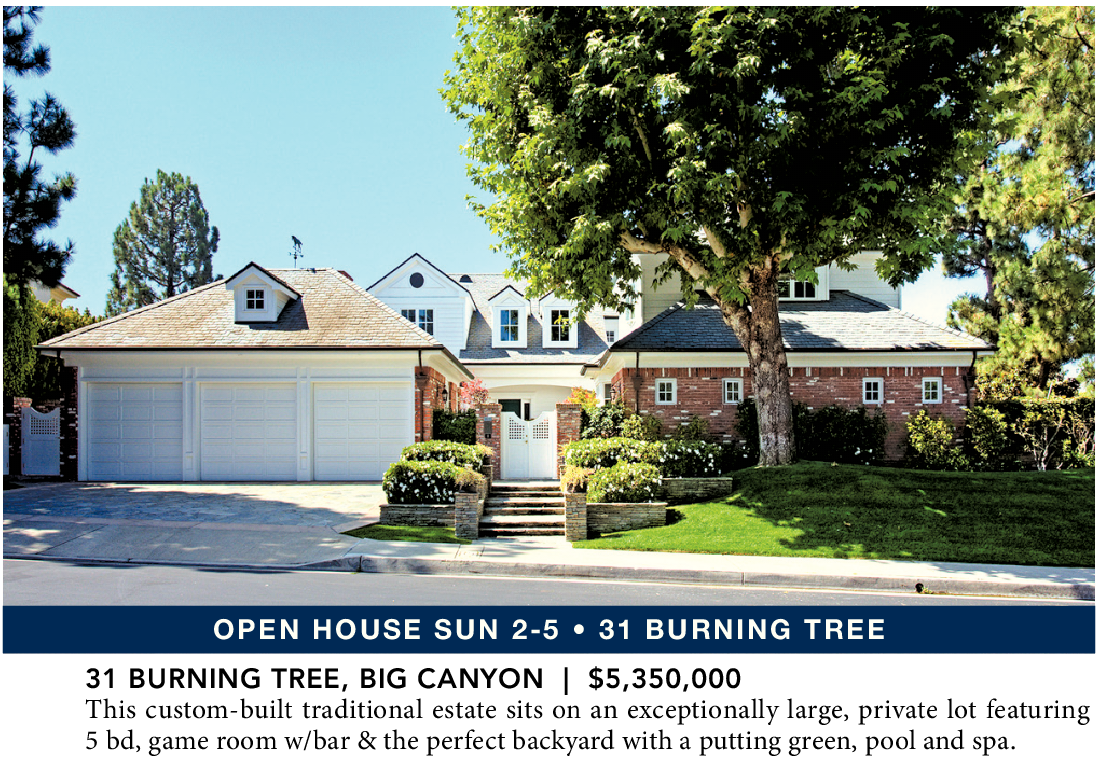 31 BURNING TREE, BIG CANYON | $5,350,000 This custom-built traditional estate sits on an exceptionally large, private lot featuring 5 bd, game room w/bar & the perfect backyard with a putting green, pool and spa.