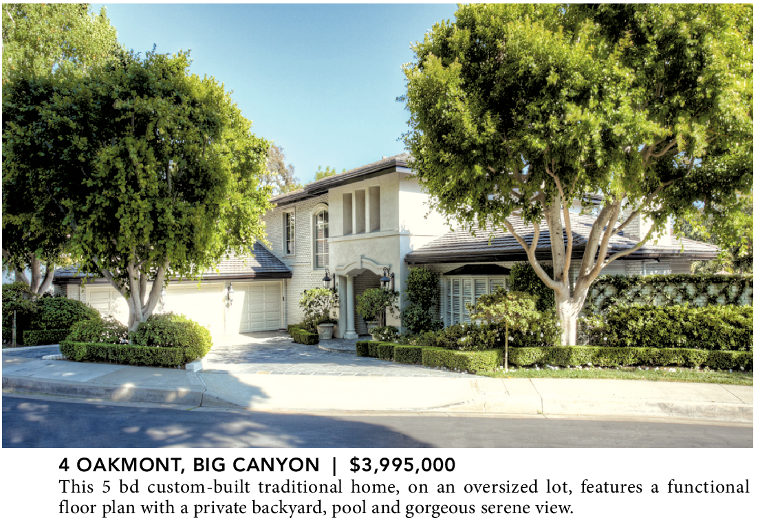 4 OAKMONT, BIG CANYON | $3,995,000 This 5 bd custom-built traditional home, on an oversized lot, features a functional floor plan with a private backyard, pool and gorgeous serene view.