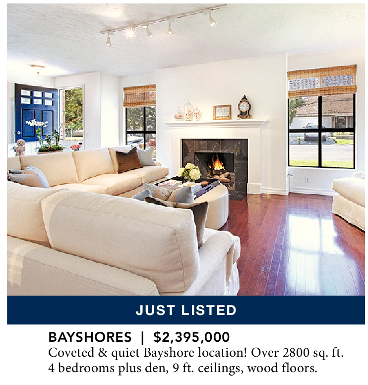 BAYSHORES | $2,395,000 Coveted & quiet Bayshore location! Over 2800 sq. ft. 4 bedrooms plus den, 9 ft. ceilings, wood floors.