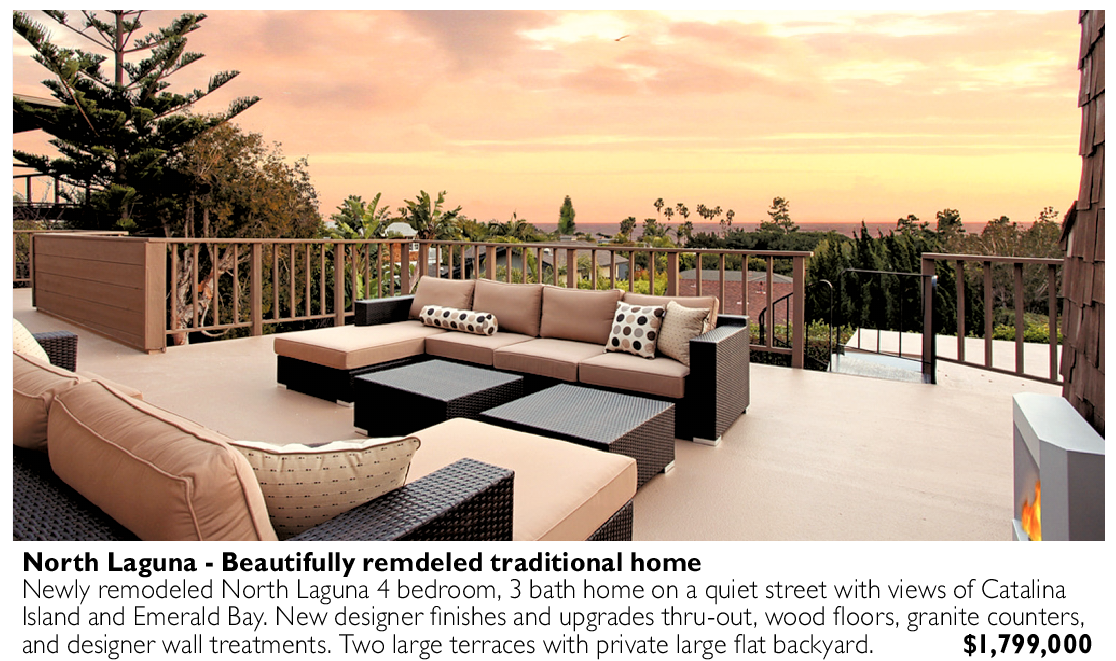 North Laguna - Beautifully remdeled traditional home Newly remodeled North Laguna 4 bedroom, 3 bath home on a quiet street with views of Catalina Island and Emerald Bay. New designer finishes and upgrades thru-out, wood floors, granite counters, and designer wall treatments. Two large terraces with private large flat backyard. $1,799,000