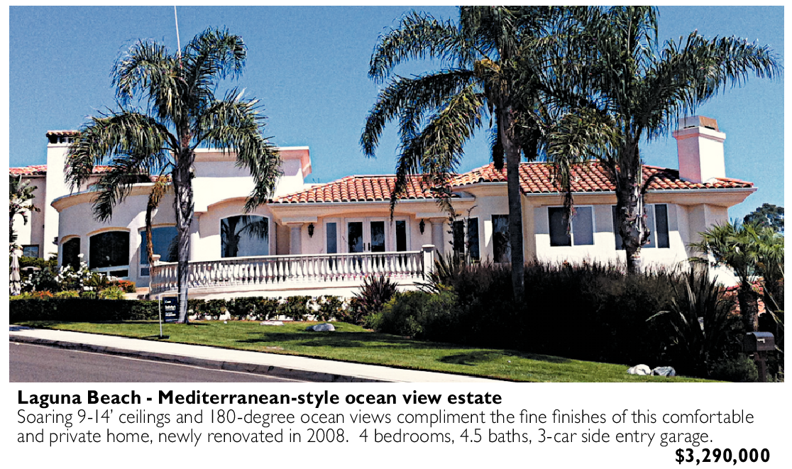 Laguna Beach - Mediterranean-style ocean view estate Soaring 9-14’ ceilings and 180-degree ocean views compliment the fine finishes of this comfortable and private home, newly renovated in 2008. 4 bedrooms, 4.5 baths, 3-car side entry garage.