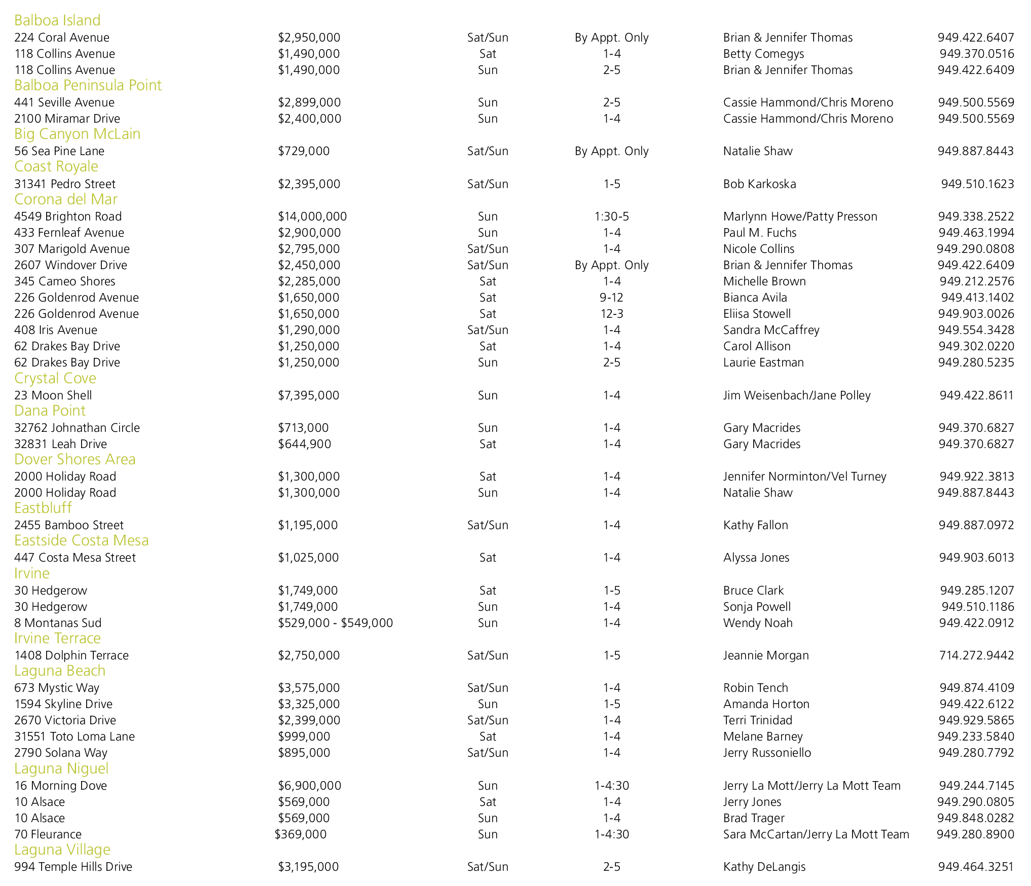 Balboa Island 224 Coral Avenue $2,950,000 Sat/Sun By Appt. Only Brian & Jennifer Thomas 949.422.6407 118 Collins Avenue $1,490,000 Sat 1-4 Betty Comegys 949.370.0516 118 Collins Avenue $1,490,000 Sun 2-5 Brian & Jennifer Thomas 949.422.6409 Balboa Peninsula Point 441 Seville Avenue $2,899,000 Sun 2-5 Cassie Hammond/Chris Moreno 949.500.5569 2100 Miramar Drive $2,400,000 Sun 1-4 Cassie Hammond/Chris Moreno 949.500.5569 Big Canyon McLain 56 Sea Pine Lane $729,000 Sat/Sun By Appt. Only Natalie Shaw 949.887.8443 Coast Royale 31341 Pedro Street $2,395,000 Sat/Sun 1-5 Bob Karkoska 949.510.1623 Corona del Mar 4549 Brighton Road $14,000,000 Sun 1:30-5 Marlynn Howe/Patty Presson 949.338.2522 433 Fernleaf Avenue $2,900,000 Sun 1-4 Paul M. Fuchs 949.463.1994 307 Marigold Avenue $2,795,000 Sat/Sun 1-4 Nicole Collins 949.290.0808 2607 Windover Drive $2,450,000 Sat/Sun By Appt. Only Brian & Jennifer Thomas 949.422.6409 345 Cameo Shores $2,285,000 Sat 1-4 Michelle Brown 949.212.2576 226 Goldenrod Avenue $1,650,000 Sat 9-12 Bianca Avila 949.413.1402 226 Goldenrod Avenue $1,650,000 Sat 12-3 Eliisa Stowell 949.903.0026 408 Iris Avenue $1,290,000 Sat/Sun 1-4 Sandra McCaffrey 949.554.3428 62 Drakes Bay Drive $1,250,000 Sat 1-4 Carol Allison 949.302.0220 62 Drakes Bay Drive $1,250,000 Sun 2-5 Laurie Eastman 949.280.5235 Crystal Cove 23 Moon Shell $7,395,000 Sun 1-4 Jim Weisenbach/Jane Polley 949.422.8611 Dana Point 32762 Johnathan Circle $713,000 Sun 1-4 Gary Macrides 949.370.6827 32831 Leah Drive $644,900 Sat 1-4 Gary Macrides 949.370.6827 Dover Shores Area 2000 Holiday Road $1,300,000 Sat 1-4 Jennifer Norminton/Vel Turney 949.922.3813 2000 Holiday Road $1,300,000 Sun 1-4 Natalie Shaw 949.887.8443 Eastbluff 2455 Bamboo Street $1,195,000 Sat/Sun 1-4 Kathy Fallon 949.887.0972 Eastside Costa Mesa 447 Costa Mesa Street $1,025,000 Sat 1-4 Alyssa Jones 949.903.6013 Irvine 30 Hedgerow $1,749,000 Sat 1-5 Bruce Clark 949.285.1207 30 Hedgerow $1,749,000 Sun 1-4 Sonja Powell 949.510.1186 8 Montanas Sud $529,000 - $549,000 Sun 1-4 Wendy Noah 949.422.0912 Irvine Terrace 1408 Dolphin Terrace $2,750,000 Sat/Sun 1-5 Jeannie Morgan 714.272.9442 Laguna Beach 673 Mystic Way $3,575,000 Sat/Sun 1-4 Robin Tench 949.874.4109 1594 Skyline Drive $3,325,000 Sun 1-5 Amanda Horton 949.422.6122 2670 Victoria Drive $2,399,000 Sat/Sun 1-4 Terri Trinidad 949.929.5865 31551 Toto Loma Lane $999,000 Sat 1-4 Melane Barney 949.233.5840 2790 Solana Way $895,000 Sat/Sun 1-4 Jerry Russoniello 949.280.7792 Laguna Niguel 16 Morning Dove $6,900,000 Sun 1-4:30 Jerry La Mott/Jerry La Mott Team 949.244.7145 10 Alsace $569,000 Sat 1-4 Jerry Jones 949.290.0805 10 Alsace $569,000 Sun 1-4 Brad Trager 949.848.0282 70 Fleurance $369,000 Sun 1-4:30 Sara McCartan/Jerry La Mott Team 949.280.8900 Laguna Village 994 Temple Hills Drive $3,195,000 Sat/Sun 2-5 Kathy DeLangis 949.464.3251