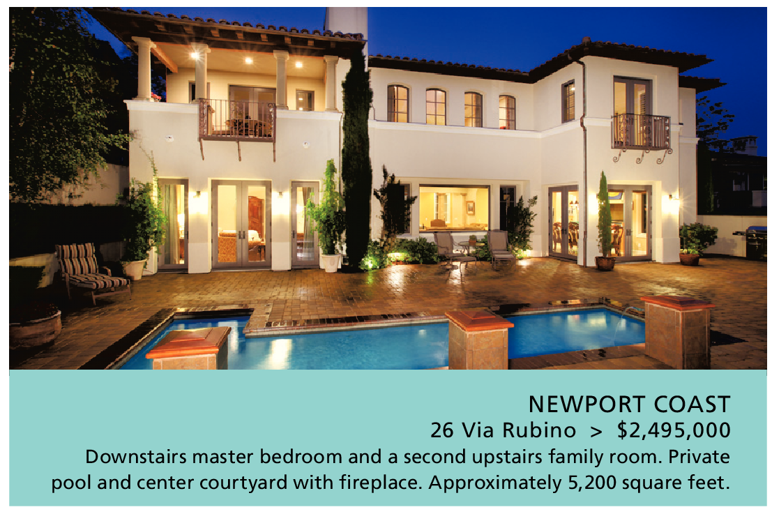 NEWPORT COAST 26 Via Rubino > $2,495,000 Downstairs master bedroom and a second upstairs family room. Private pool and center courtyard with fireplace. Approximately 5,200 square feet.