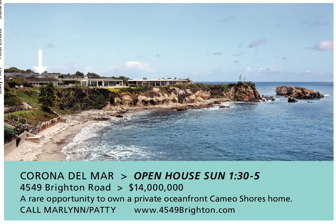 CORONA DEL MAR > OPEN HOUSE SUN 1:30-5 4549 Brighton Road > $14,000,000 A rare opportunity to own a private oceanfront Cameo Shores home. CALL MARLYNN/PATTY www.4549Brighton.com