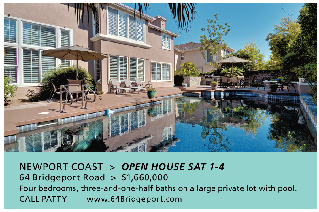 NEWPORT COAST > OPEN HOUSE SAT 1-4 64 Bridgeport Road > $1,660,000 Four bedrooms, three-and-one-half baths on a large private lot with pool. CALL PATTY www.64Bridgeport.com