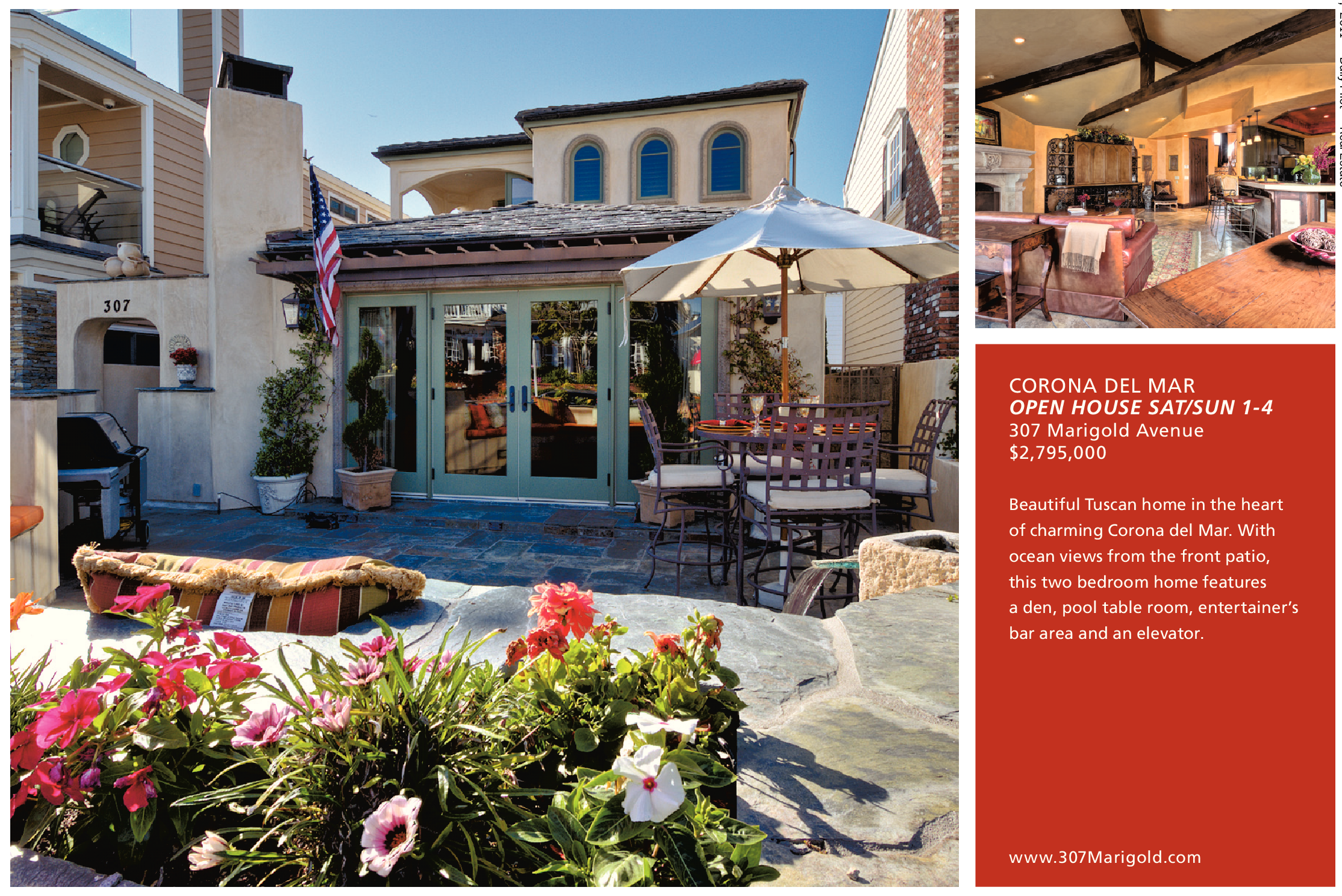 CORONA DEL MAR OPEN HOUSE SAT/SUN 1-4 307 Marigold Avenue $2,795,000 Beautiful Tuscan home in the heart of charming Corona del Mar. With ocean views from the front patio, this two bedroom home features a den, pool table room, entertainer’s bar area and an elevator. www.307Marigold.com