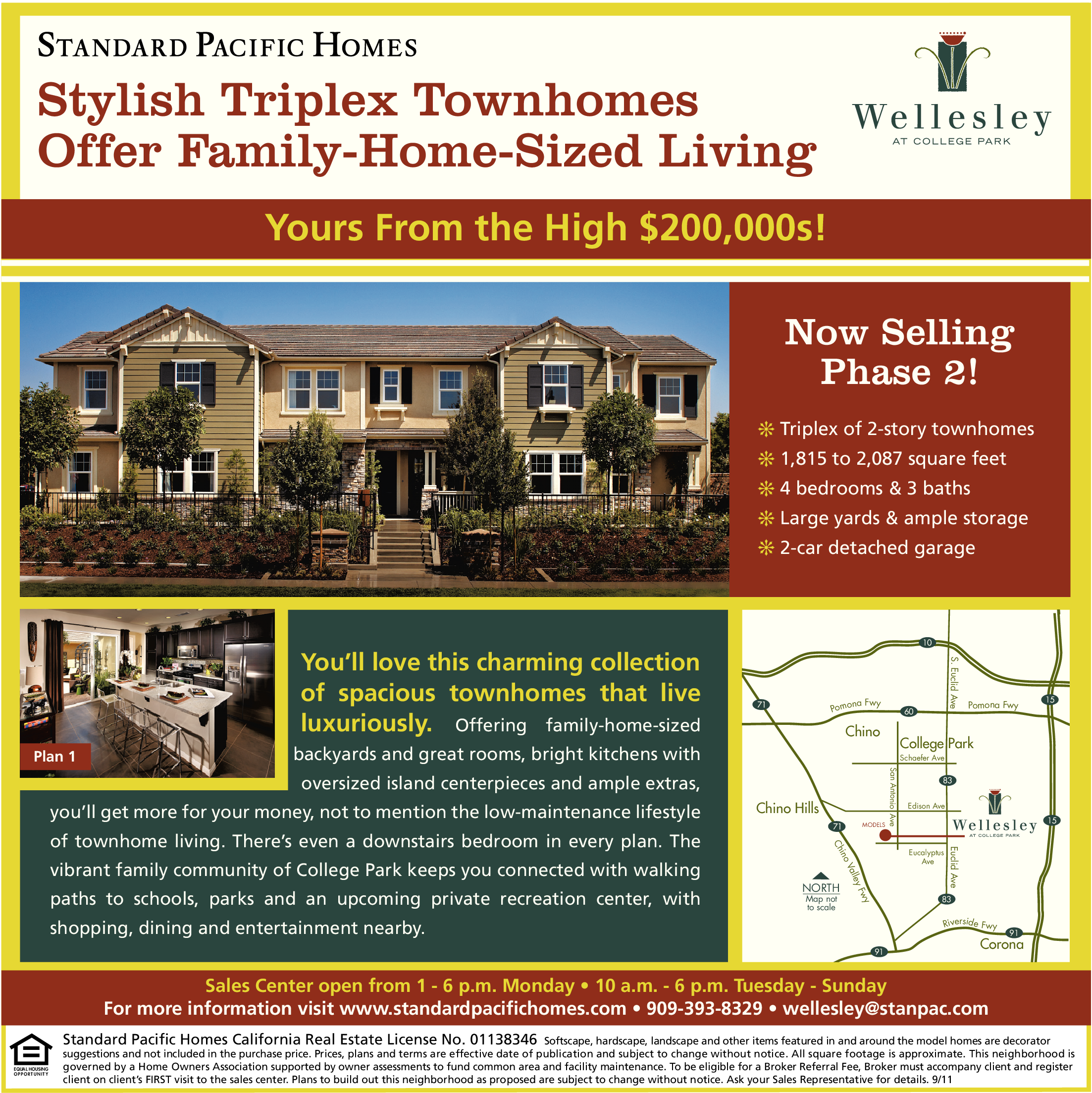 EQUAL HOUSING OPPORTUNITY Stylish Triplex Townhomes Offer Family-Home-Sized Living Yours From the High $200,000s! You’ll love this charming collection of spacious townhomes that live luxuriously. Offering family-home-sized Plan 1 backyards and great rooms, bright kitchens with oversized island centerpieces and ample extras, you’ll get more for your money, not to mention the low-maintenance lifestyle of townhome living. There’s even a downstairs bedroom in every plan. The vibrant family community of College Park keeps you connected with walking paths to schools, parks and an upcoming private recreation center, with shopping, dining and entertainment nearby. Now Selling Phase 2! v Triplex of 2-story townhomes v 1,815 to 2,087 square feet v 4 bedrooms & 3 baths v Large yards & ample storage v 2-car detached garage Chino Hills Standard Pacific Homes California Real Estate License No. 01138346 Softscape, hardscape, landscape and other items featured in and around the model homes are decorator suggestions and not included in the purchase price. Prices, plans and terms are effective date of publication and subject to change without notice. All square footage is approximate. This neighborhood is governed by a Home Owners Association supported by owner assessments to fund common area and facility maintenance. To be eligible for a Broker Referral Fee, Broker must accompany client and register client on client’s FIRST visit to the sales center. Plans to build out this neighborhood as proposed are subject to change without notice. Ask your Sales Representative for details. 9/11 NORTH Map not to scale Chino MODELS 60 10 College Park Sales Center open from 1 - 6 p.m. Monday • 10 a.m. - 6 p.m. Tuesday - Sunday For more information visit www.standardpacifichomes.com • 909-393-8329 • wellesley@stanpac.com 91 Schaefer Ave Edison Ave Eucalyptus Ave 83 83 91 Corona 15 15