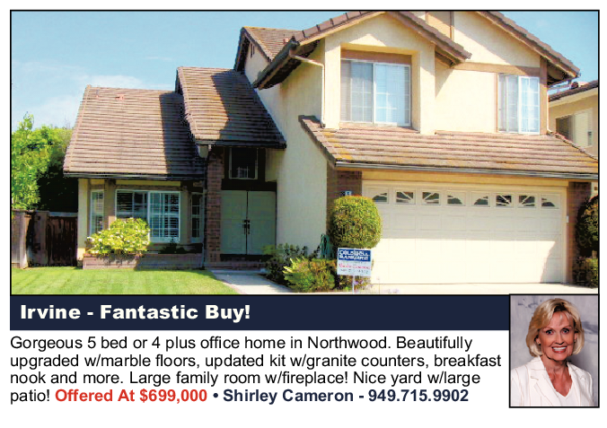 Gorgeous 5 bed or 4 plus office home in Northwood. Beautifully upgraded w/marble floors, updated kit w/granite counters, breakfast nook and more. Large family room w/fireplace! Nice yard w/large patio! Offered At $699,000 • Shirley Cameron - 949.715.9902