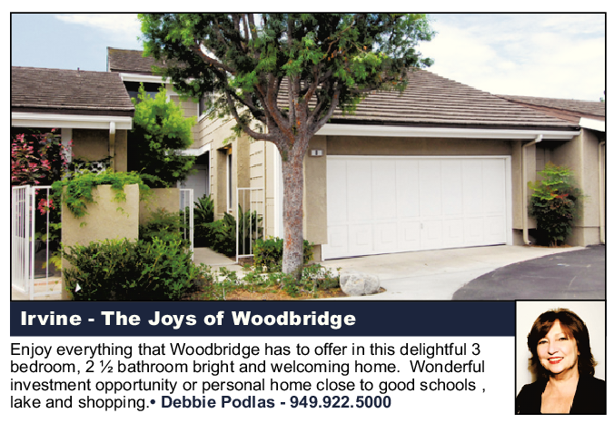 Irvine - The Joys of Woodbridge Enjoy everything that Woodbridge has to offer in this delightful 3 bedroom, 2 ½ bathroom bright and welcoming home. Wonderful investment opportunity or personal home close to good schools , lake and shopping.• Debbie Podlas - 949.922.5000