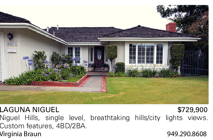 LAGUNA NIGUEL $729,900 Niguel Hills, single level, breathtaking hills/city lights views. Custom features, 4BD/2BA. Virginia Braun 949.290.8608