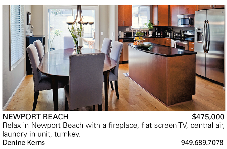 NEWPORT BEACH $475,000 Relax in Newport Beach with a fireplace, flat screen TV, central air, laundry in unit, turnkey. Denine Kerns 949.689.7078