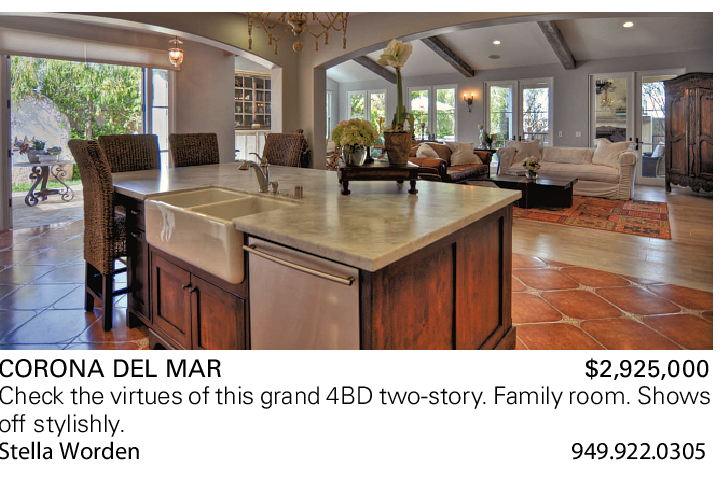 CORONA DEL MAR $2,925,000 Check the virtues of this grand 4BD two-story. Family room. Shows off stylishly. Stella Worden 949.922.0305
