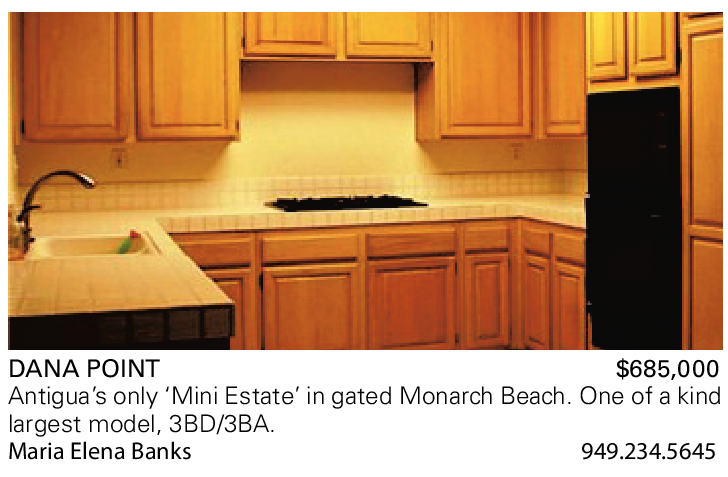 DANA POINT $685,000 Antigua’s only ‘Mini Estate’ in gated Monarch Beach. One of a kind largest model, 3BD/3BA. Maria Elena Banks 949.234.5645