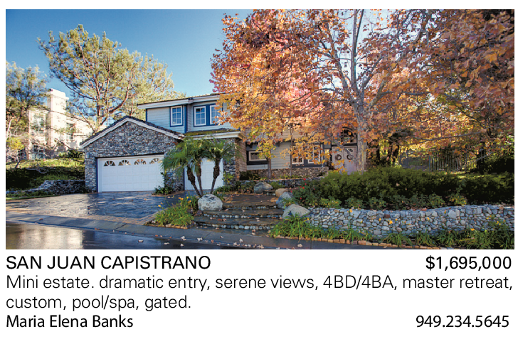 SAN JUAN CAPISTRANO $1,695,000 Mini estate. dramatic entry, serene views, 4BD/4BA, master retreat, custom, pool/spa, gated. Maria Elena Banks 949.234.5645