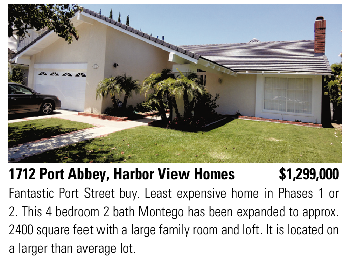 1712 Port Abbey, Harbor View Homes $1,299,000 Fantastic Port Street buy. Least expensive home in Phases 1 or 2. This 4 bedroom 2 bath Montego has been expanded to approx. 2400 square feet with a large family room and loft. It is located on a larger than average lot.