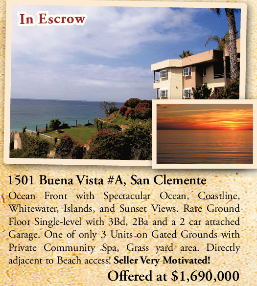 1501 Buena Vista #A, San Clemente Ocean Front with Spectacular Ocean, Coastline, Whitewater, Islands, and Sunset Views. Rare Ground Floor Single-level with 3Bd, 2Ba and a 2 car attached Garage. One of only 3 Units on Gated Grounds with Private Community Spa, Grass yard area. Directly adjacent to Beach access! Seller Very Motivated! Offered at $1,690,000