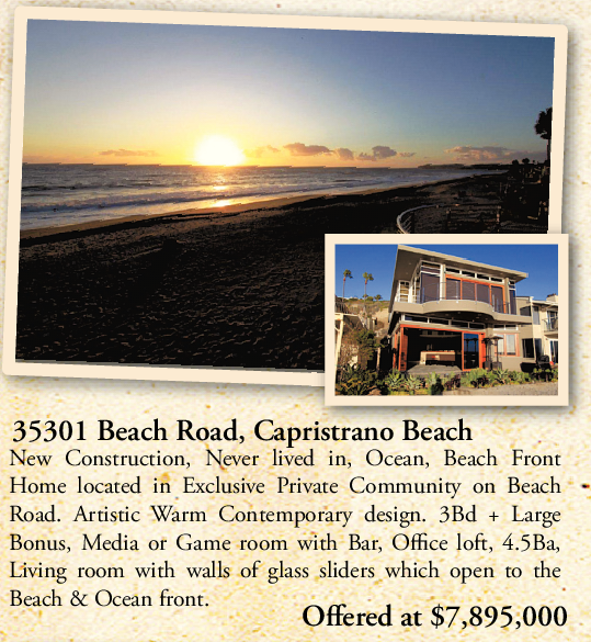 35301 Beach Road, Capristrano Beach New Construction, Never lived in, Ocean, Beach Front Home located in Exclusive Private Community on Beach Road. Artistic Warm Contemporary design. 3Bd + Large Bonus, Media or Game room with Bar, Office loft, 4.5Ba, Living room with walls of glass sliders which open to the Beach & Ocean front. Offered at $7,895,000